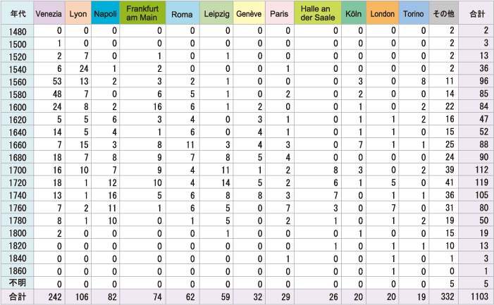 16世紀においては、ヴェネツィアおよびリヨンが優勢であるが、17世紀から18世紀になると、出版地はヨーロッパ各都市に分散している。