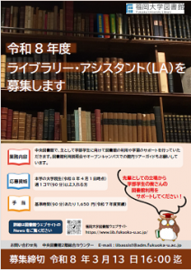 福岡大学中央図書館では、学部学生に図書館の利用や学習サポート等を行うライブラリー・アシスタント(LA)を募集します。